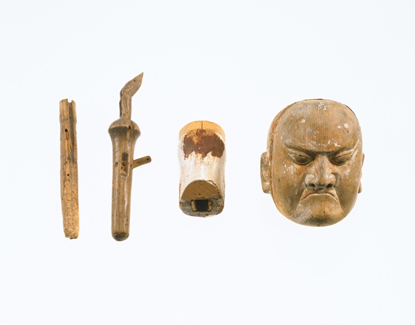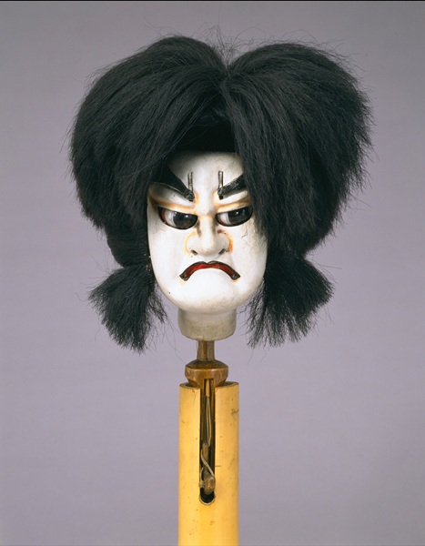 ユネスコの世界無形遺産となった人形浄瑠璃・文楽では、かしらと右手を遣う主遣い、左手を遣う左遣い、足を遣う足遣いの3人で1体の人形を操る(三人遣い)。人形のかしらには、役柄の性格、「性根」があり、それを造形と仕掛けによる動きで表現している。大阪歴史博物館の文楽人形コレクションは、前身の大阪市立博物館が、昭和35年(1960)の開館以来、積極的に収集したもので、コレクターが収集してきた古い人形かしらを中心に収蔵する。1体の人形に組んだものを含めて約170点あり、立役、女方、特殊かしらの様々な種類が含まれる。戦時中、四ツ橋文楽座にあった文楽人形が戦災で失われたため、こうしたコレクターの収集品が戦後復興期の文楽で使用されたこともある。当館の文楽人形コレクションは、江戸時代後期から大正・昭和期の大阪の文楽人形の姿、歴史を伝える貴重な存在である。(澤井浩一)