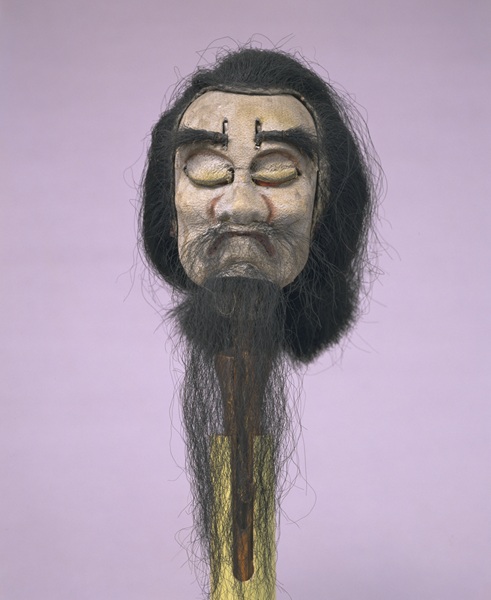 娘は15~20歳くらいの乙女の女形かしらで、町娘からお姫様まで幅広く用いられる。本品に所蔵焼印を残す扇屋三郎兵衛は新町廓の置屋で、人形浄瑠璃を愛好し、人形遣い初代吉田玉造(1829-1905)の贔屓でもあった。「義経千本桜」道行初音の旅で、現れた忠信と連れ舞などを演じる静御前の人形に拵えられている。人形拵えは人形遣い、吉田文雀(1928~2016)による。文楽人形かしら 景清
