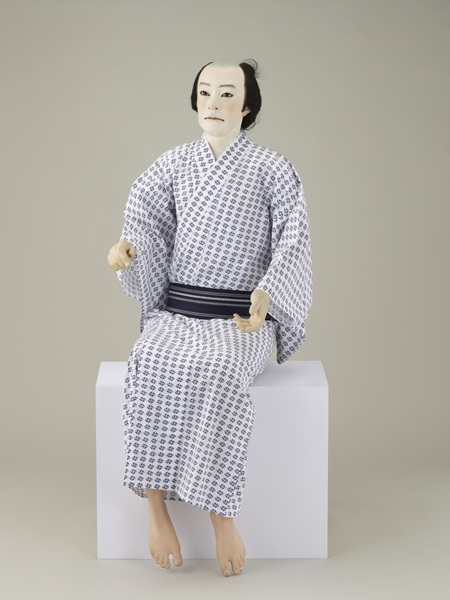 大阪で絶大な人気があった初代鴈治郎をモデルとする生人形。心斎橋筋にあった久留米絣の老舗「くるめや」が、町人姿(本品)と武士の姿の人形の2種を制作し、町人姿は浴衣のマネキンとして用いられた。その姿は『写真心斎橋』(1935年)に掲載される店舗の写真でも確認できる。首(頭部)、両手、両足の造形部分には胡粉の上に着色が施され、着衣に隠される上半身と下半身の2つの胴体部は、ラワン材、布、針金等で製作される。