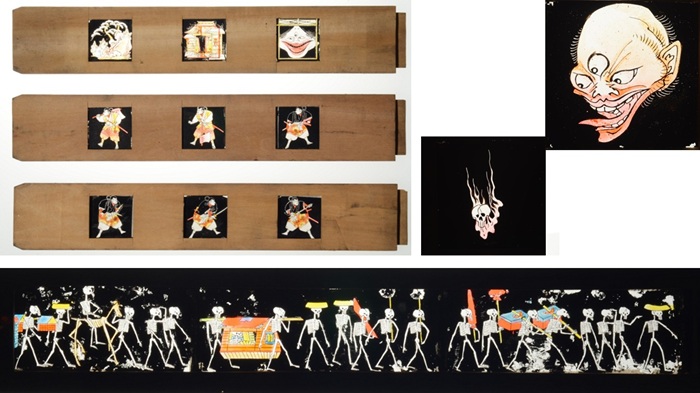 平将門の遺児で、謀反を企む滝夜叉姫の物語に取材した演目の種板。全部で17枚あり、総画数116点、動きのある絵11点、背景22点である。姫が妖術で妖怪を呼び出し仲間を集め、将門が築いた相馬の古内裏を根城にすることから、古内裏の廃屋の背景、妖怪変化が多く描かれている。長大な骸骨の行列を表す長引きの種板も含まれる。四代目富士川都正旧蔵品。