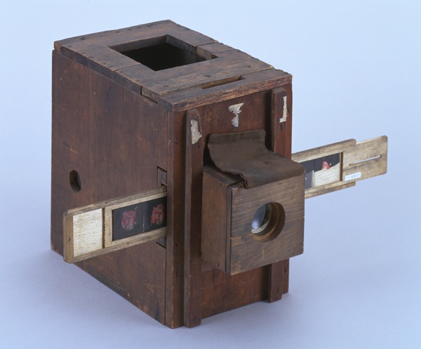 種板の画像を投影する木製の幻灯機。光源を収める本体部分とレンズ部分からなる。着脱可能なレンズ部分は、ヘリコイド的に伸縮し、焦点合わせ、拡大・縮小を行える機構で、前面に布製シャッターが装備される。現在の光源は白熱電球だが、元は石油ランプであったと考えられ、本体上部には放熱およびランプの火屋を出すための穴がある。種板は本体側面と上部のスリットから差し込む。京都の錦影絵師、歌川都司春の旧蔵品。種板「道化獅子買」