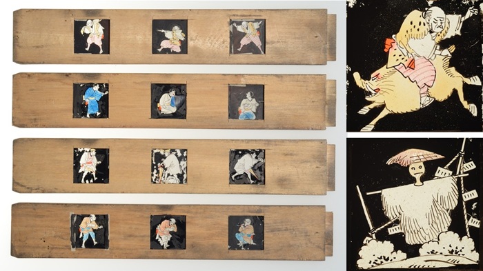 落語「池田の猪買い」に取材した演目の種板で、全部で19枚。描かれる総画数は68点で、動きのある絵は15点、背景画が19点で、猟師や猪などの登場人物のほか、背景には心斎橋の交番や鉄橋、案山子などがあり、落語にはない妖怪の絵も含まれる。種板は桐材で多くはスライド構造となっている。本体とスライド板に開けた窓に、絵を描いた薄いガラス板が嵌められ、スライド板を操作して絵の人物の顔や手足の動き、場面転換などの投影画像の変化を生み出す。四代目富士川都正旧蔵品。種板「相馬 口」