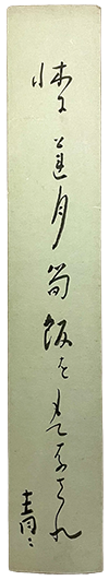 虚明の師、松瀬青々による短冊です。自著『松苗 : 句集 春』に、知人を訪ねるために京都を旅し、西芳寺にて筍飯をご馳走になったという記載があります。床の間に大田垣蓮月 (1791-1875)の賛と鳥居が描かれた掛け軸が飾っていたとも記しており、「牀に蓮月」はその情景を詠んだのでしょう。