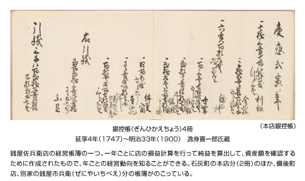 約10年前に逸身家にのこされた古文書が見つかり(逸身喜一郎氏所蔵、現在は大阪歴史博物館寄託)、東京大学文学部日本史学研究室を中心とした「逸身家文書研究会」により、関連史料も含めて調査・研究が進められました。その成果は今年10月末に『両替商 銭屋佐兵衛』(東京大学出版会)として刊行される予定です。