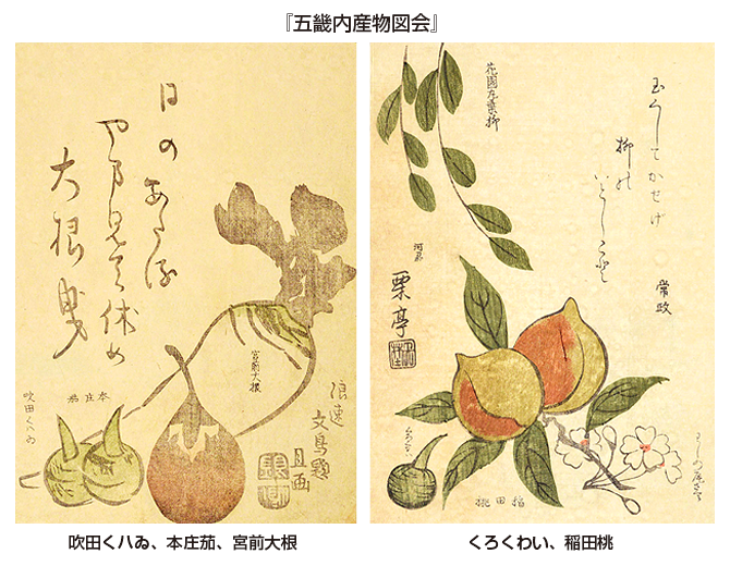 『五畿内産物図会』は、大坂で活躍した画家・大原東野の著した名物図会です。摂河泉各地域の物産を紹介する本書には、土産物や加工品などのほか、大坂の近郊地で育てられた作物も掲載されています。馴染み深いダイコンやニンジン、ナスなどの野菜や花卉、タバコ、なかには現在「なにわの伝統野菜」に選出されている吹田慈姑などもみえます。また、稲田桃など一度は失われてしまい、今日、復活栽培が進められているものも描かれています。