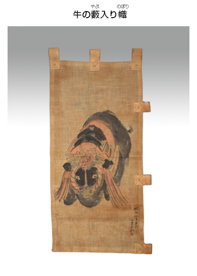 牛の藪入りは「牛駆け」とも呼ばれ、大阪近郊で5月5日に行われた行事です。特に梅田のものが有名で、この日は農耕牛を新しい鞍や種々の草花で飾り、自由に遊ばせました。端午の節供とも時期が重なり、ウシに粽を食べさせ、残りは子どもの疱瘡除けとされました。5月5日は農業や牛馬の神とされる野神の祭日にあたることから、牛の藪入りとの関係が想像されます。本資料は、上方郷土研究会が明治以降に途絶えていた本行事を復興させた際の幟です。ウシの絵は、郷土玩具を多く描いてきた川崎巨泉(1877-1942)の手になります。